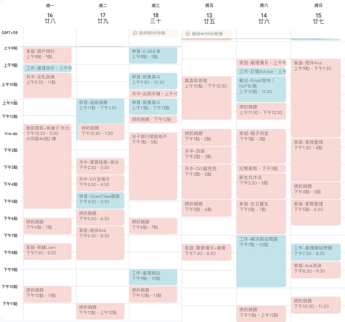 設計師愛看房 melovehouse.com Hello Reader 早安,這週你過得還好嗎?今天其實是個特別的日子...剛好是我的生日🎂 這也是我人生第二次,在有新生命陪伴的狀態下過生日 一邊看著小嬰兒睡覺,一邊默默想:原來人生真的會在某些時刻,被重新定義。 這週我也完成了入住月子中心第二週(第8–15天)的時間紀錄 比起第一週,最大的差別就是: 漲奶問題終於解決了!現在可以用電動擠奶,大幅縮短時間但另一個副作用是:哺乳真的很容易讓人嗜睡😪 所以這週我反而刻意增加了一些 睡覺與休息的時間 甚至還完成了一個小心願: 把一直想補看的 《復仇者聯盟》系列拿出來重看 雖然說是為了年底的《復仇者聯盟 5》做準備 但老實說~看到第 3 部就有點看不下去了😆 PS:自從 2019 年《復仇者聯盟 4》之後,我幾乎就沒再追漫威電影 如果你看到我附的行事曆截圖,可以很清楚看到我這個 J人 的時間分類: 🟥 紅色時間塊月子中心活動、擠奶親餵、處理彌月禮等家庭事務 🟦 藍色時間塊是學習進修與工作輸出,屬於個人事務 空白時間則是日常生活:吃飯、休息、洗澡、通話聯繫等等 入住第二週(7天)的統計如下:...